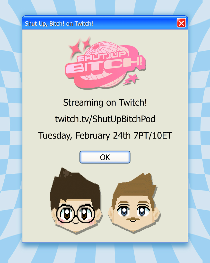 Yooo we're going to be streaming on twitch tomorrow for the first time ever and we can't wait to play game and have fun time. We'll be streaming Tuesday, February 24th at 7PT/10ET on http://www.twitch.tv/shutupbitchpod